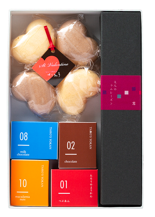 ようかん(つぶ餡1個、chocolate1個、milk chocolate1個、macadamia nuts1個)ハートもなか(コーヒーミルク餡2個、キャラメル餡2個)窓 大人のラムレーズン1本