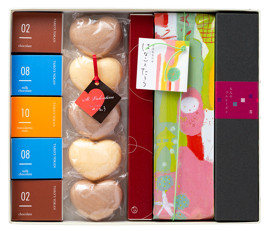 ようかん(chocolate2個、milk chocolate2個、macadamia nuts1個)、ハートもなか(コーヒーミルク餡2個、キャラメル餡3個)、地の香1本、はなことたろう1本、窓 大人のラムレーズン1本